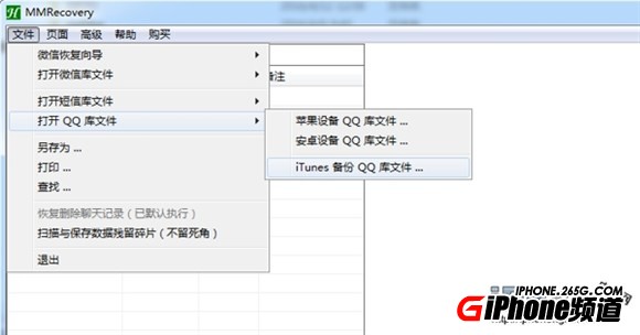 運行QQ恢復工具MMRecovery,如下圖首先點擊“文件”菜單,再點擊“打開QQ庫文件”子菜單,最後再點擊“iTunes備份QQ庫文件”子菜單,將會彈出“iTunes備份QQ恢復”對話框。