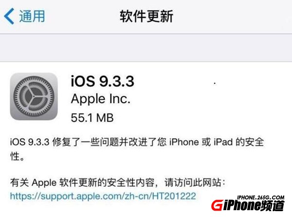 iOS 9.3.3正式版的更新內容在OTA升級界面真是簡潔到極致:iOS 9.3.3 修復了一些問題並改進了您 iPhone 或 iPa的的安全性。有關 Appe 軟件更新的安全性內容,請訪問此網站:https://support.apple.com/zh-cn/ht201222 (該頁面暫未更新到最新內容,尚不包含9.3.3更新內容)。
