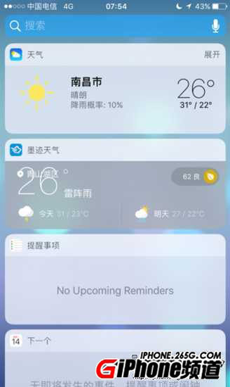 5、搜索界面:由原來的SIRI建議增加了通知中心的今天頁面,下拉的話直接進入siri建議。
