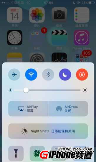 4、上拉控制中心:改變整體風格,上方的快捷鍵點亮的時候增加了不同的顏色顯示,改變護眼模式按鈕為長條!第一頁取消了音樂控制,移到控制中心第2頁(並不能自定義快捷鍵)。