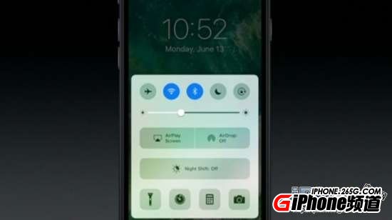 在iOS10中,屏幕下方的控制欄有了一個全新的外觀。下方原先的五個應用快捷鍵改為了四個,被刪掉的NightShift功能快捷鍵改到了上方更顯眼的位置,替換了原先AirDrop的位置。