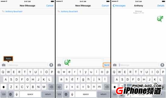 8.點擊發送就可以將新的表情符號發送給對方了,不要擔心對方看不到這些新的表情,因為這是以小圖片文件格式發送,對方運行較老版本的iOS系統應該也是能夠看到的。