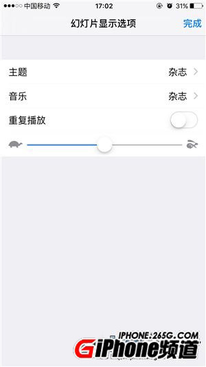 ⑤滑動橫桿即可調成幻燈片播放速度,主題可以修改播放主題樣式,音樂可以修改背景音樂(還可以從iTunes音樂庫中挑選音樂)