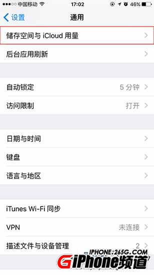 ②找到【儲存空間與iCloud用量】選項,點擊進入