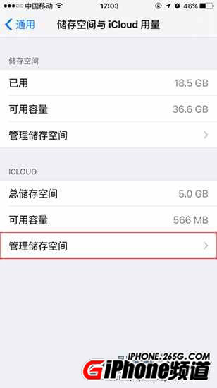 ③點擊打開iCloud項目下的【管理儲存空間】選項
