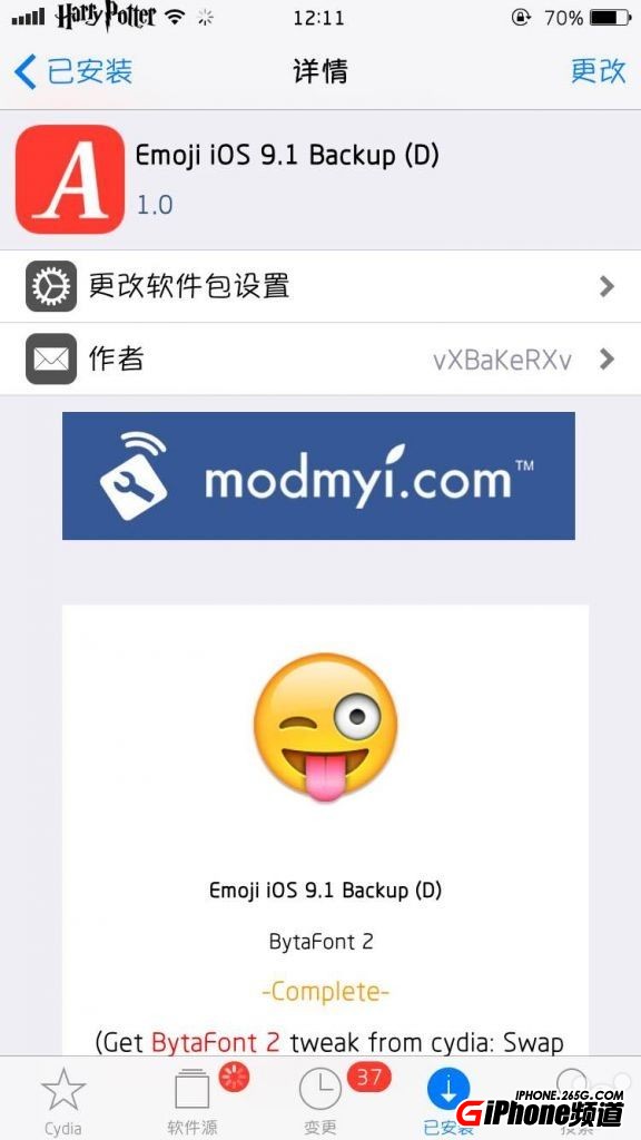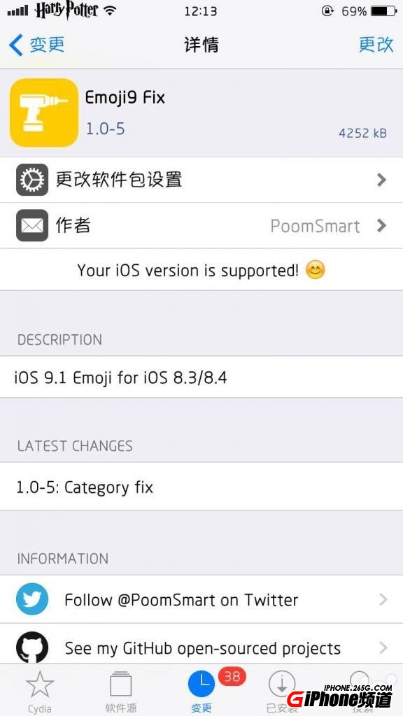 需要注意的是,Emoji9 Fix 這個插件的說明中只提到了適用於 iOS 8.3 和 iOS 8.4 系統,其他系統請勿使用。iOS 7.0 到 iOS 8.2 系統用戶可以搜索 emoji9 legacy[beta] 這個插件。當然,iOS 9.0 用戶也可以嘗試一下,但是有什麼後果就不知道了。