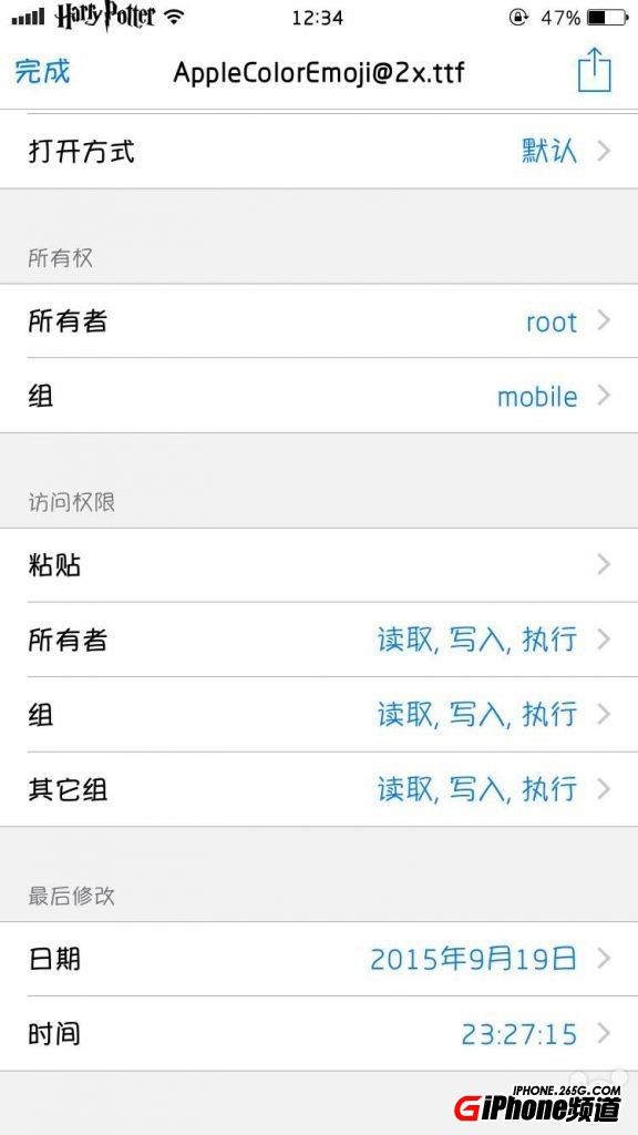 - 用 filza 或者 iFile 進入字體文件夾查看表情字體的權限,路徑是 /System/Library/Fonts/core,如上圖所示。
