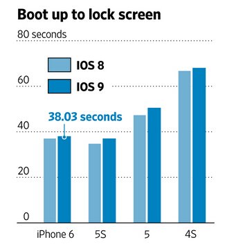 《華爾街日報》記者傑弗裡·福勒(GEOFFREY A. FOWLER)在前4代iPhone上對iOS 9進行了測試,它們是:iPhone 4S、5、5S和6。他的結論是,至少在今年,蘋果的軟件不是現有iPhone顯得“老態龍鐘”的罪魁禍首。