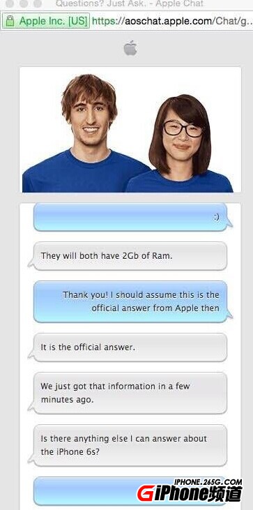 從網友發布的蘋果客服聊天截圖可以看到,蘋果客服回答“They will both have 2GB of Ram”,這個They顯然是iPhone6S和iPhone6S Plus,2GB Ram就是2GB運行內存的意思。