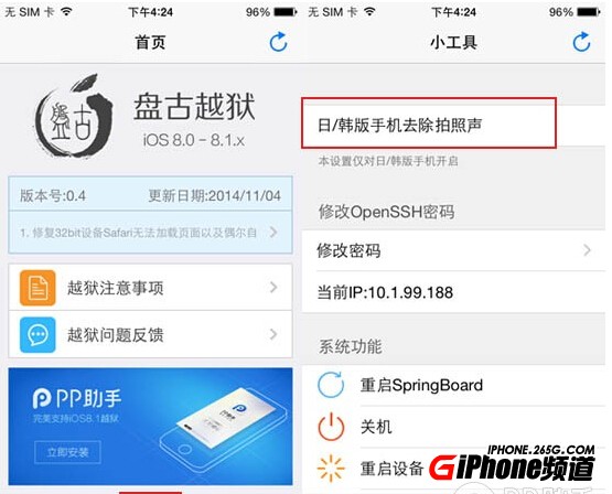 打開盤古程序,依次點擊【小工具】-【日/韓版手機去除拍照聲】就是這麼簡單,當然,前提是你需要越獄。點擊【這裡】查看。