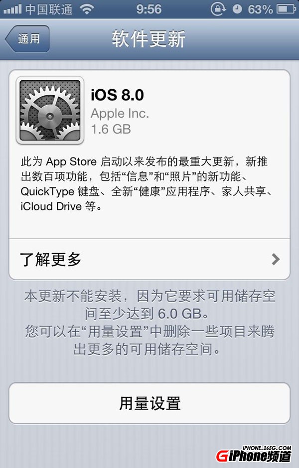 目前iPhone 4s及以上型號、iPad 2及以上型號、第五代iPod Touch及iPad Mini等蘋果移動設備均支持iOS8該系統,且根據上圖可知,此次安裝iOS 8,需要至多5.7GB甚至更多的可用空間,部分iPad型號則需要7GB左右的可用空間。另外,8GB iPhone 5c和16GB iPhone,在升級安裝iOS8時,似乎也可能遇到問題。