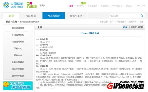 日前,湖南移動官網已經開啟了iPhone 6的預訂,活動頁面提供了iPhone 6的參數規格以及開賣日期。