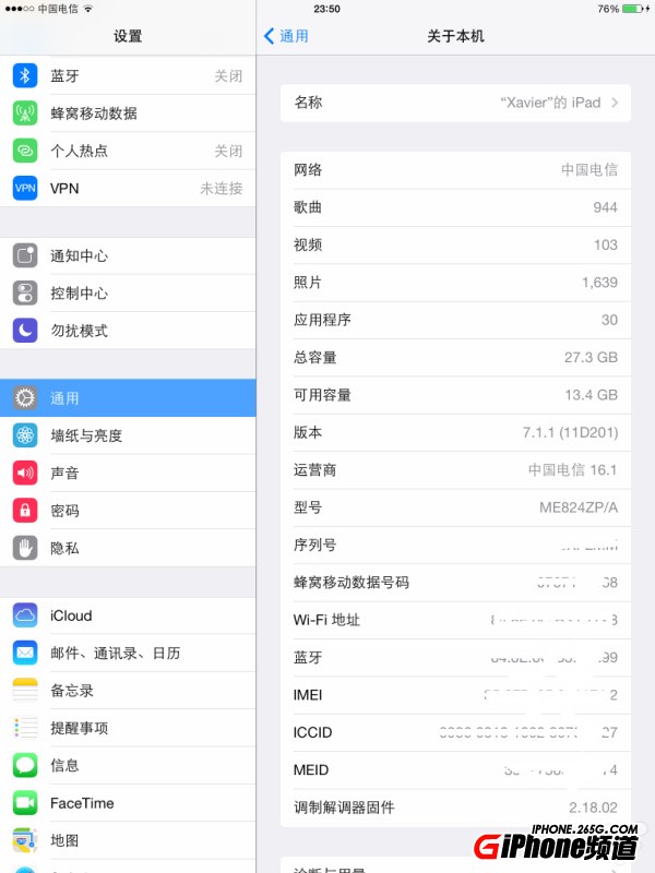 1.首先確保你的系統是iOS7.1-iOS7.1.1(在“設置”-“通用”-關於本機中查看),如果不是,請先到iTunes中升級。