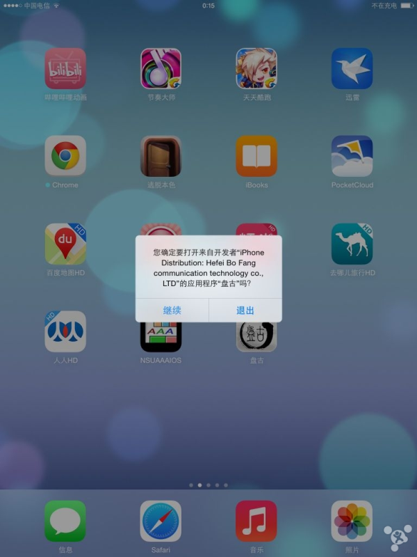 7.解鎖設備,看到桌面上有盤古圖標,點擊圖標,會提示一個警告框,點繼續。