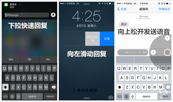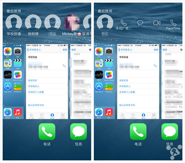 蘋果這次其中一個大受稱贊的升級就是增加了信息的快速回復,當信息彈出的時候,無論是在主屏還是在鎖屏界面,你都可以對其進行快速回復。相信不少看了 WWDC 視頻的用戶,都知道如何進行操作,在主屏的時候當推送消息彈出,都可以下滑進行快速回復,值得一提的是,信息功能現在可以發送語音信息了,只要對方擁有蘋果設備,通過一個向上滑動的手勢就可以免費發送(經過測試,目前向 iOS 7 設備發送語音,也可以進行播放)。此外還增加了群聊模式。不要忘了這次在多任務切換界面的改動,iOS 8 在應用切換預覽卡片的上方放入了最近聯系人的“大頭貼”,這也是另一個可以快速發送信息的途徑,只要點擊聯系人的頭像,就可以進行快速撥號,發送短信,FaceTime 視頻等。