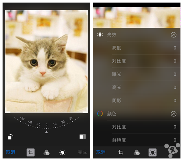 有了這個功能,你還需要下載其它的編輯工具嗎,如果再加上美膚功能,看來一大批應用瞬間鴨梨山大。在 iOS 8 中,蘋果為照片增加了更多的編輯功能,點擊編輯,你就可以對照片進行多個角度的選擇,蘋果為此提供了一個轉盤,還整合了截圖功能,點擊轉盤下的還原就可以還原到最初的圖片效果。之所以說一大批圖形編輯應用會顫抖,還是由於蘋果添加了可以自定義參數的光效(包括亮度,對比度,曝光等)和顏色設置(包括對比度和鮮艷度)。