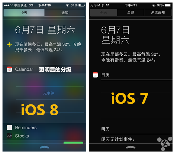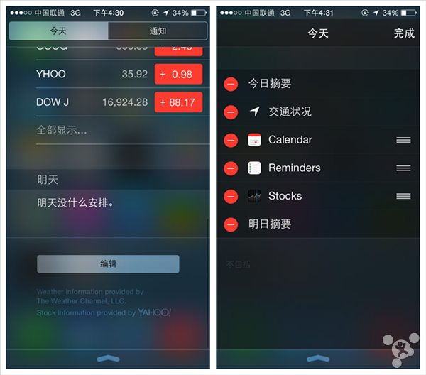 在 iOS 7 發布之後,小編就有一個疑問,究竟 iOS 7 中通知中心的“全部”和“未讀通知”的獨立存在的意義是什麼。而在 iOS 8,蘋果也似乎采用了用戶的建議,將上述兩個合二為一,變成“通知”。在 iOS 8 中,每一個項目的分類更加明顯,通過加深每個分類的顏色來讓視圖更為直觀。而頂部的編輯按鈕,可以讓你直接在通知中心裡對不想提醒的通知進行移除,例如股票,也可以根據喜歡調整先後順序。