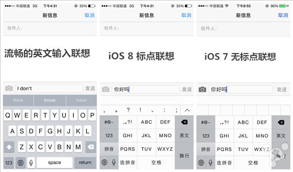 用“歎為觀止”來形容 iOS 8 的英文輸入法可以說是毫不為過。如果你是做外貿或者是從事英語行業工作的,我一定推薦你使用原生的 iOS 8 鍵盤輸入法。蘋果第一次開放了鍵盤供開發者開發第三方的鍵盤輸入法,而且是否授權使用這些第三方的輸入法,使用權也是在你的手中。只要打開英文鍵盤,就能夠看到 3 個備選的單詞,每輸入一個字符,候選的單詞都會進行更新或為你進行修正。而且隨著你游標的移動,也會發生相應的聯想改變。