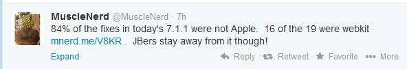 MuscleNerd:而我們熟知的肌肉男也發表了對 iOS 7.1.1 的推特,他說此次 84% 的修復都和蘋果無關,修復的 19 個安全問題中,有 16 個都是屬於浏覽器核心。最後附上一句:越獄用戶請遠離(7.1.1)。