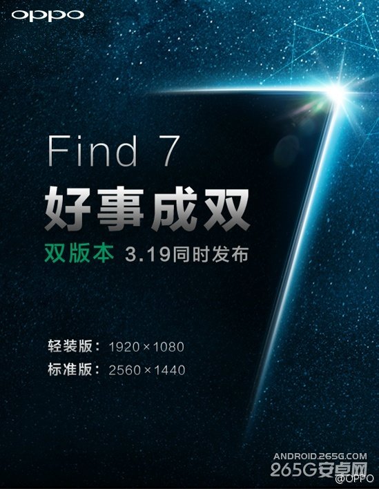OPPO官方微博近日宣布,OPPO Find 7將會推出雙版本,分別是輕裝版與標准版,其中標准版采用2560x1440分辨率的頂級屏幕,輕裝版則使用1920x1080分辨率屏幕,這兩款OPPO Find 7都將會在3月19日發布。