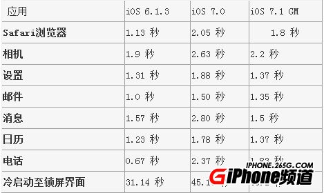 為了讓數據更直觀,這個測試還專門准備了一台iOS7.0系統的iPhone 4進行對比。測試以三次打開應用的平均時間作為考量數據,每次打開應用前均使用iOS7的多任務管理界面強退此前的程序。測試結果表明,iOS7.1的多款系統應用的打開速度較iOS 7都有不同程度的提升,但距離最流暢的iOS 6.1.3還有一定的距離。