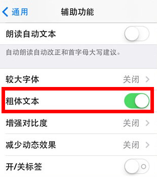 要設置加粗很簡單,打開 設置–>通用–>輔助功能,向下滑動找到“粗體文字”,將右側的開關按鈕打開,