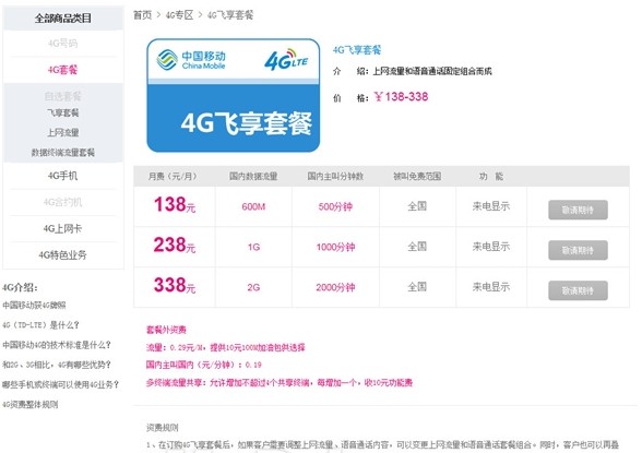 中國移動4G飛享套餐一共分為三檔: