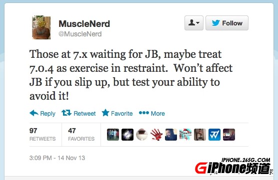 iOS7.0.4的更新發布後沒多久,越獄大神肌肉男表示,iOS 7.0.4不會對完美越獄帶來任何影響,大家可以放心大膽的升級。