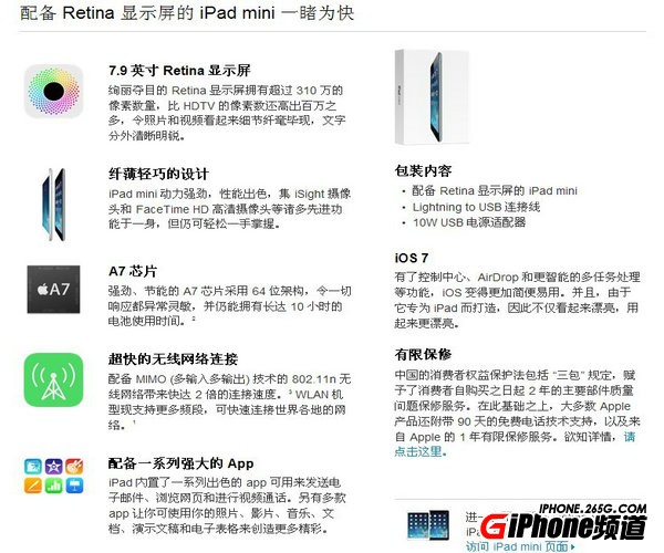 在蘋果發布會之後,中國蘋果官網上立刻更新了ipad mini2的具體售價和配置,關於配置,小編就拿官網放出的截圖供大家參考!