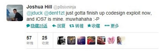 有很多網友關心iOS7是否能越獄的問題,根據前綠毒團隊成員在Twitter上的發言稱,已經掌握了iOS7越獄所需的漏洞,就等iOS7發布。看他Twitter得意忘形的樣子,黑客們應該會在第一時間為果粉們帶來iOS7完美越獄的。