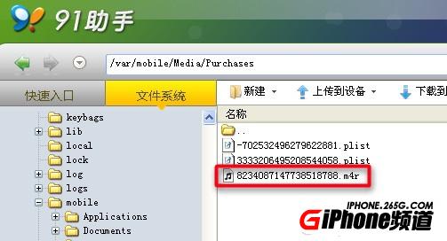 iPhone非系統自動的鈴聲文件路徑為:/var/mobile/Media/Purchases/,在這個文件目錄中一些以一長段數字命名,以“m4r”為後綴的文件,就是我們要找的“非自帶電話鈴聲”(如下圖所示)