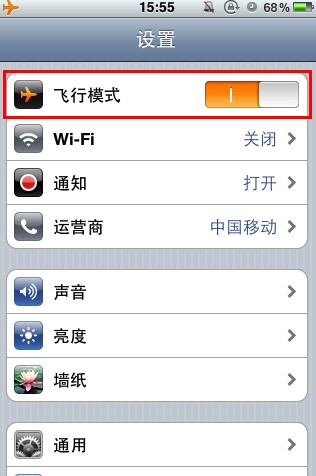 一個是利用飛行模式就是下面那圖,點一次開關,稍等,看手機、短信、網絡等功能都關閉以後再點一次開關,關閉飛行模式。這樣就完成了程序的軟重啟。這麼做的好處是不完美越獄的機器不用重新啟動整個手機。