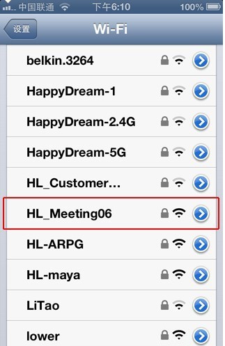 選擇你可以連接並使用的無線網絡(WIFI),如HL_Meeting06是我現在可以連接的WIFI,如下圖: