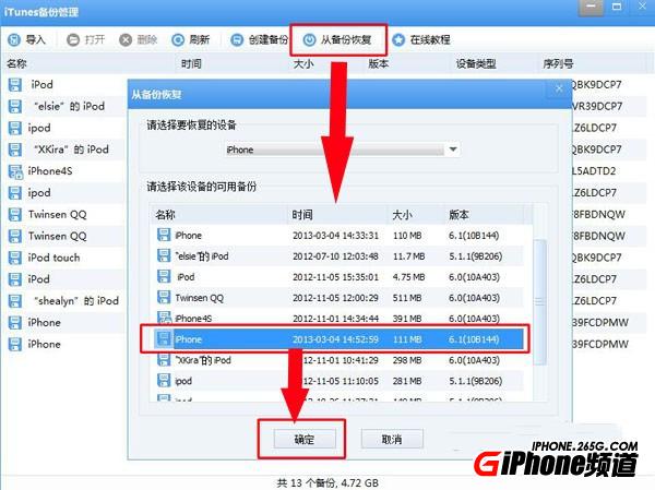 注:恢復前iPhone一定要有足夠的內存,否則會恢復失敗哦。所需內存可在選擇恢復備份列表欄查看。