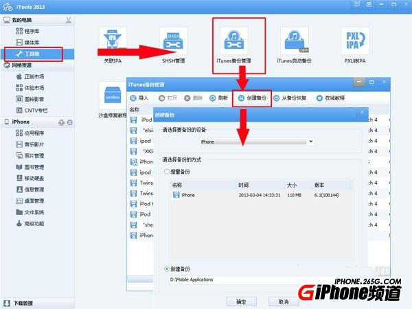 第一步,創建備份。連接iPhone,進入iTools【工具箱—iTunes備份管理】,點擊【創建備份—新建備份】,耐心等待備份完成。