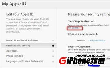 點擊左側的Password and Security後,點擊右側Two-Step Verfication(兩步驗證)下的Get Started。