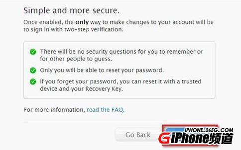 一旦開啟,更改你的帳戶信息就只接受Two-Step Verfication(兩步驗證)登陸。你不需要再記安全問題也不能通過使用安全問題來試圖重置你的密碼。只有你自己才可以重置密碼。一旦你忘記密碼,你可以使用受信任的設備和恢復密鑰重置它。