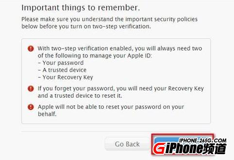 英譯文:開啟Two-Step Verfication(兩步驗證)後,你需要以下數據來管理人的Apple ID:密碼、可信的設備(你的iPhone/iPad/iPod touch)、你的恢復密鑰。如果你不小心忘記了密碼,你可能需要恢復密鑰和可信設備來重設密碼。蘋果也不能幫助你重設密碼,注意是不能,而不是不會。