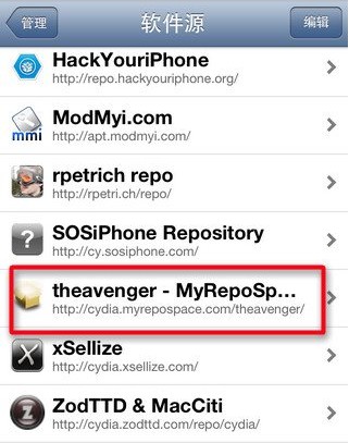 1. 首先到Cydia裡,添加源址:http://cydia.myrepospace.com/theavenger(如何添加源:點擊進入)