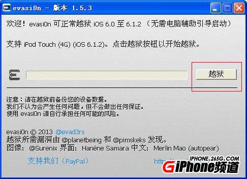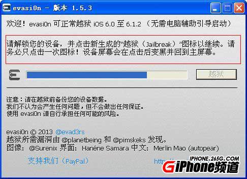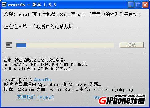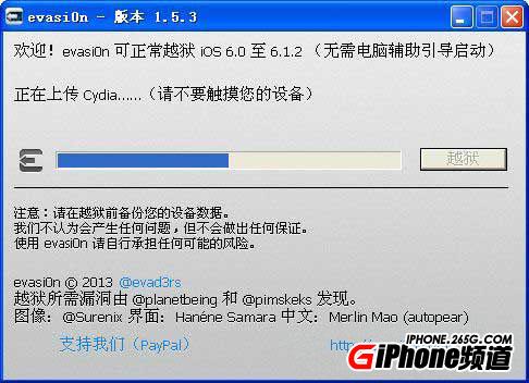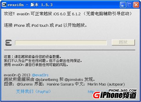 evasi0n 1.5.3完美越獄6.1.2教程 evasi0n緊急發布了1.5.3版,主要修復了1.5.2版本中在windows系統下崩潰的BUG,另外保留了之前版本中對中文,法文,德文的支持。由於iOS6.1.3固件Beta版已經修復了越獄漏洞,所以在大神願意利用新漏洞越獄之前,iOS6.X的完美越獄將暫時停留在iOS6.1.2完美越獄。下面的教程已完美越獄越獄6.1.2為例。