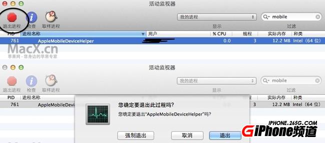 Mac系統下,請先退出iTunes,之後使用Spotlight搜索並打開系統自帶軟件“活動監視器”,右上方搜索AppleMobileDeviceHelper,選中該進程並強制手動退出該進程,之後重啟iTunes