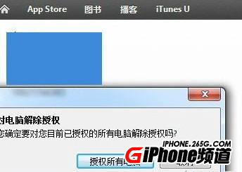 5、在彈出的對話框中,選擇“授權所有電腦”。這裡的表達可能有點不夠完善,反正意思就是“解除所有授權”。點擊之後等待iTunes運行即可完成。
