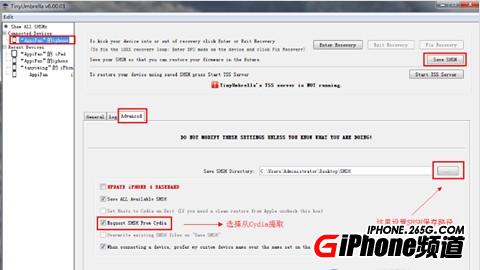 首先我們把下載好的小雨傘解壓,打開小雨傘後在左側選擇你連接的設備,然後再右側選擇【Advanced】,在下方勾選【Request SHSH From Cydia】,選擇這個是因為可以從Cydia裡直接提取之前你備份的SHSH,因為在iOS5.1.1越獄後Cydia都會自動為我們備份的。最後設置你存放SHSH的路徑,再點擊【Save SHSH】就可以保存SHSH了。