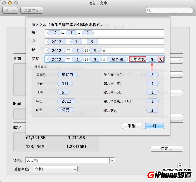2)將你想顯示的信息拖到顯示框中,並加入文字你喜歡的文字,比如在MAC中顯示今天是今年的第幾天 第幾周。(同樣你也可以選擇第幾季度,本月的第幾個星期,本月的第多少周,今年的第多少周等等)