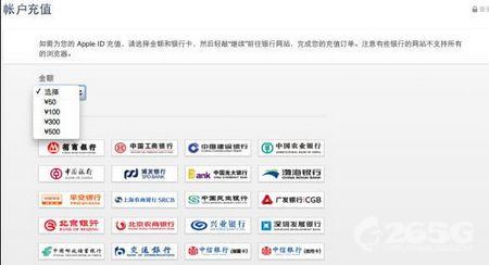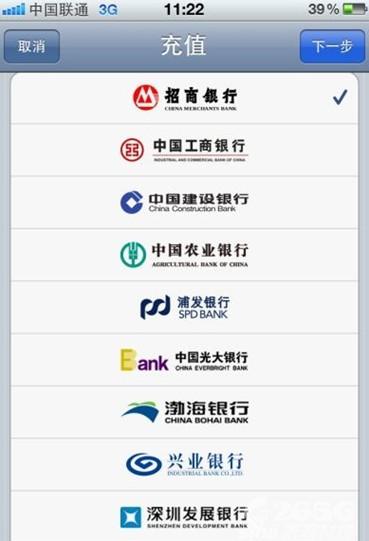 我們以iPhone的App Store為例,在點擊充值圖標後,可以顯示目前的余額以及可選擇充值金額的界面,目前支持賬戶進行50/100/300/500元人民幣充值。選擇金額後,會彈出目前在iOS設備上支持的銀行:招商銀行、工商銀行、建設銀行、農業銀行、浦發銀行、光大銀行、渤海銀行、深圳發展銀行、郵政儲蓄、交通銀行、中信銀行(儲蓄卡)、華夏銀行、東亞銀行、貴陽銀行、錦州銀行、稠州銀行等。