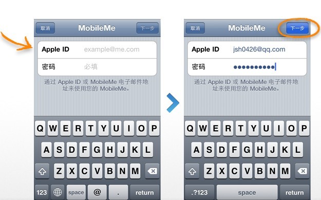 如果你已訂閱了 MobileMe 服務,輸入你的 me.com 或 mac.com 郵箱地址和密碼即可。