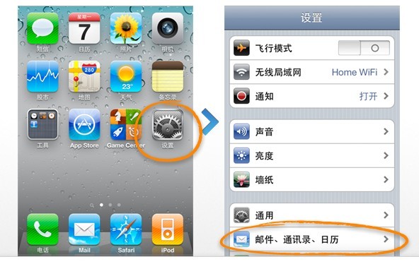 iPhone4S設置Find my iPhone教程1輕點設置圖標,然後選擇郵件、通訊錄、日歷。