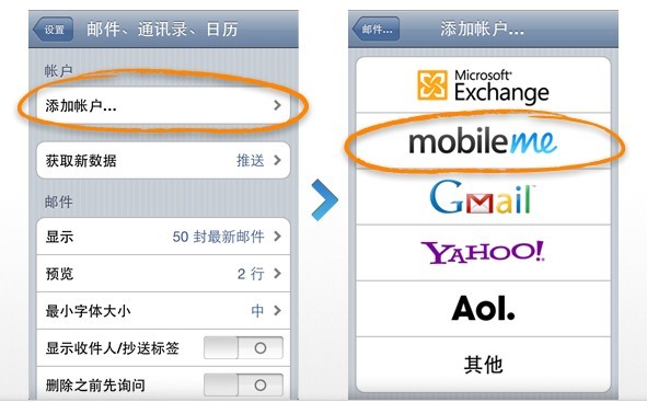 2輕點添加帳戶按鈕,再選擇 MobileMe。