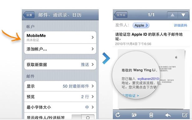 如果你的 MobileMe 帳戶顯示“尚未驗證”,登錄你的郵箱查收來自 Apple 的相關郵件。點擊“現在驗證”,然後用你的 Apple ID 登錄即可。