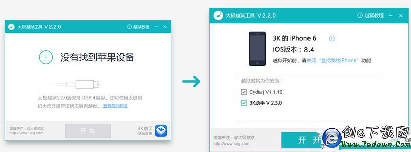 開始越獄,打開太極越獄工具並連接蘋果設備